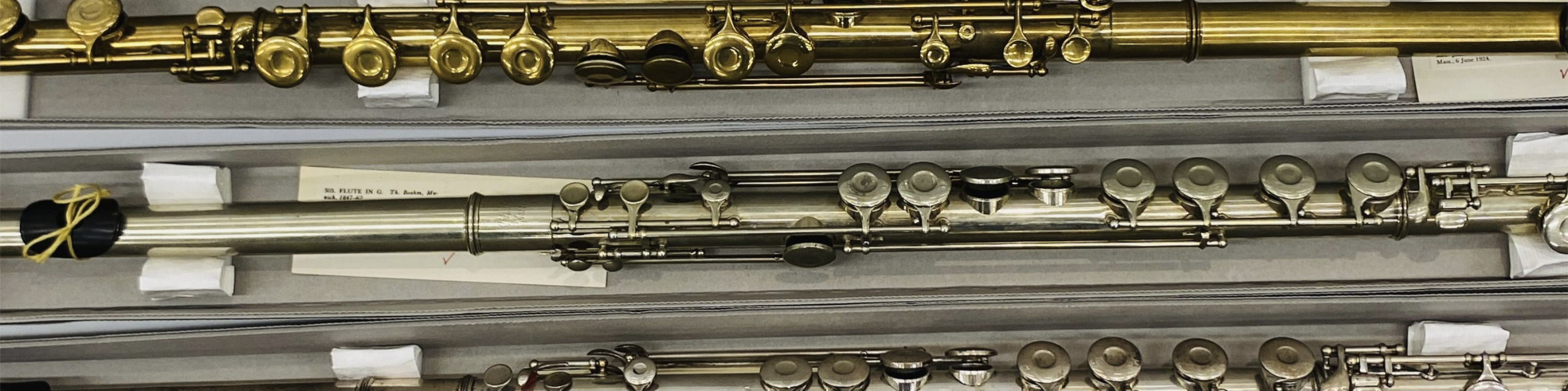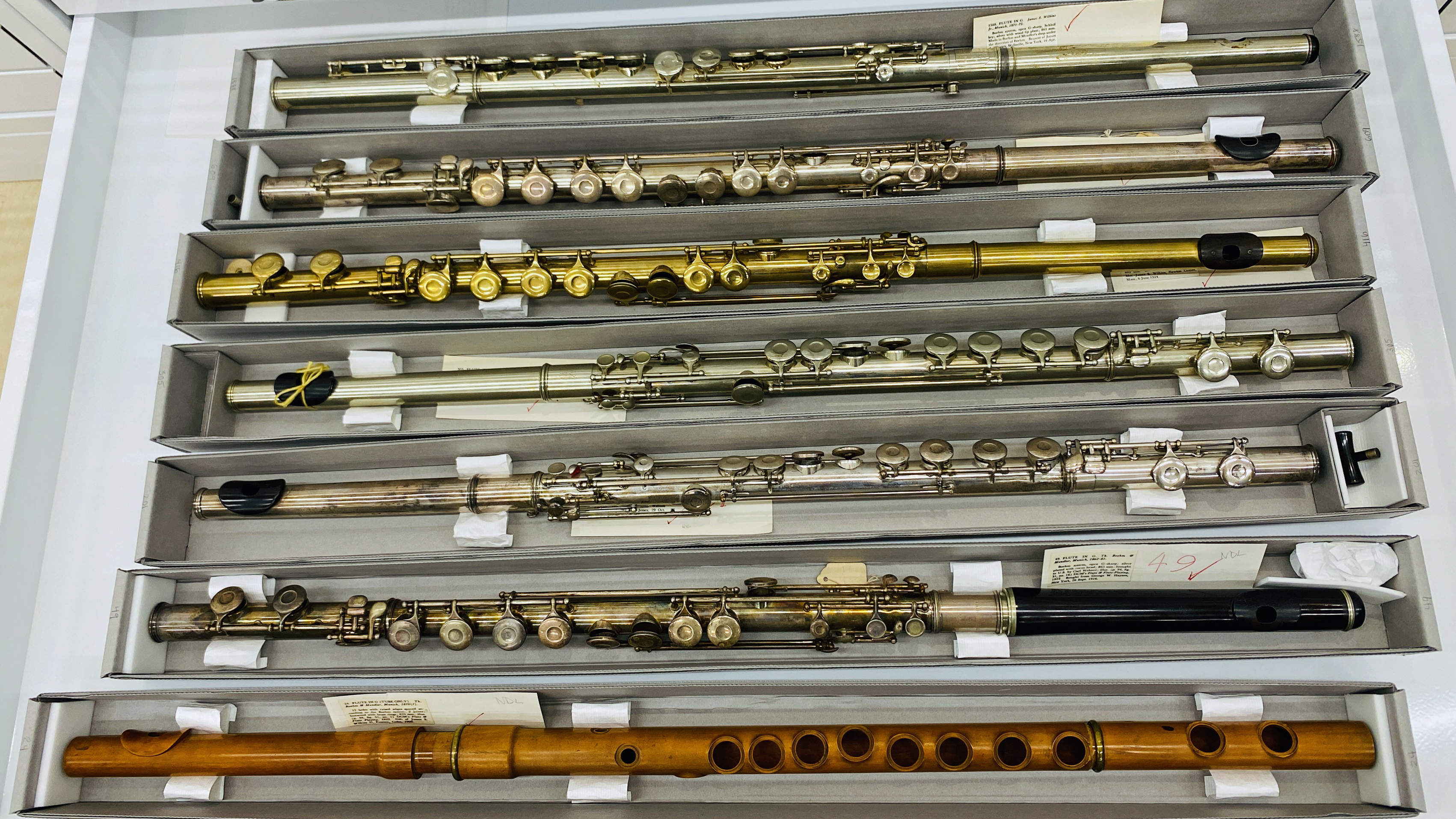 The Library of Congress houses the world’s largest flute collection, containing nearly 2,000 flutes and related reference materials. Dayton C. Miller, a physicist and passionate flutist, donated the collection in 1941. Miller began collecting flutes at the end of the 19th century, amassing instruments from around the world and spanning various time periods. The Music Division’s instrument collections also include bowed stringed instruments by Amati, Stradivari, Guarneri, Gagliano, and Rombouts; bows by Tourte, Peccatte and Tubbs; keyboards by Pleyel; guitars by Gibson; and most recently, the collection of flutes belonging to Mary Jean Simpson. The flute collection is in the James Madison Building in Washington, D.C.; a small selection of Miller flutes is on exhibit in the Whittall Pavilion, Thomas Jefferson Building, and, in a brand new “Treasures Gallery,” the flute that belonged to James Madison (which was played by Lizzo) is on special display until the end of the year.