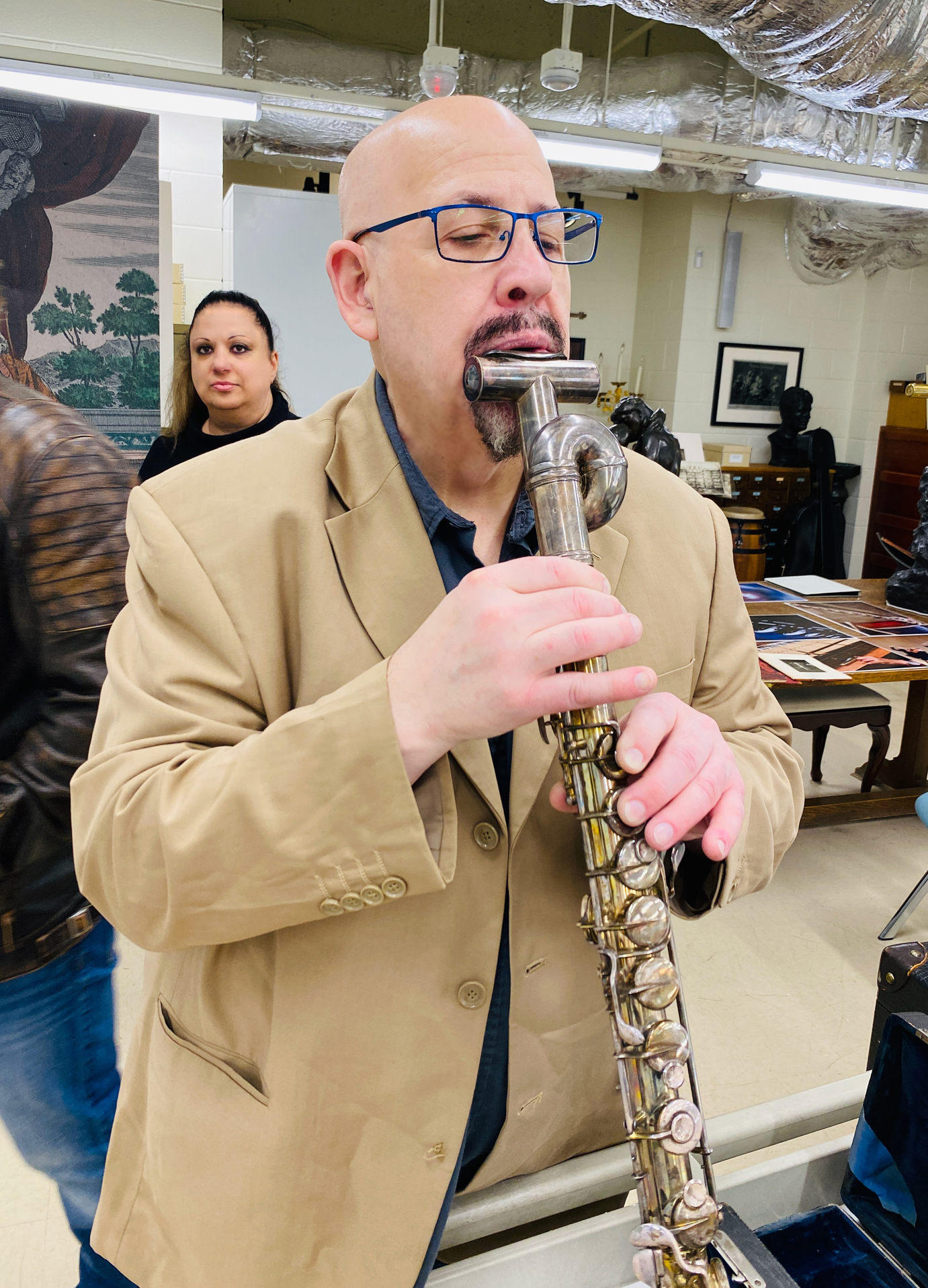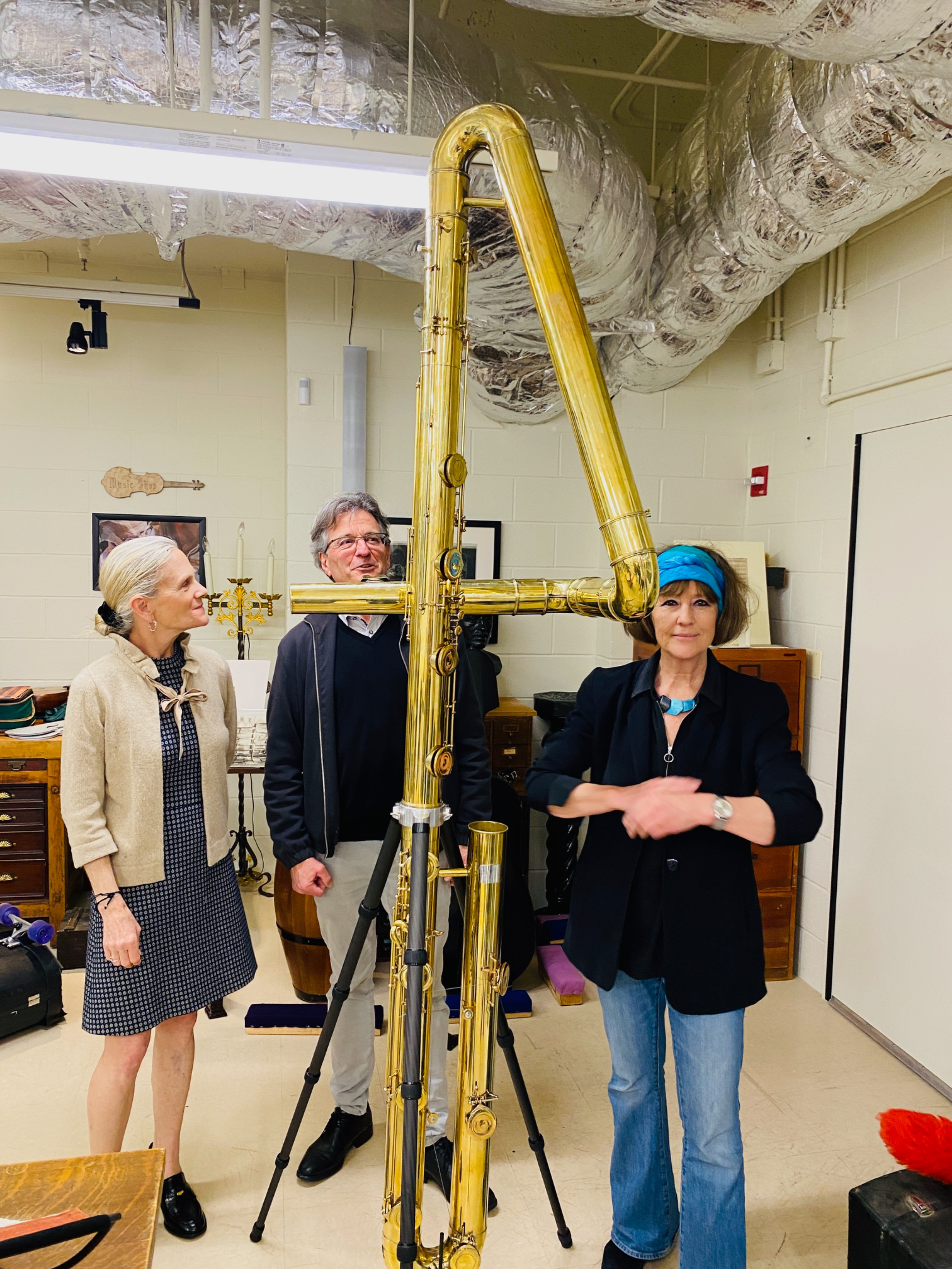 Once fully assembled, Ward-Bamford remarked that Miller certainly didn’t have anything close to the size of Kingma’s double contra in his collection. Fully stretched out at approximately 16 feet, it is tuned in C with a range starting three octaves below the C-flute. When everything was ready, other members of the music division staff joined us to admire one of the world’s largest flutes and hear Ziegler demonstrate it.